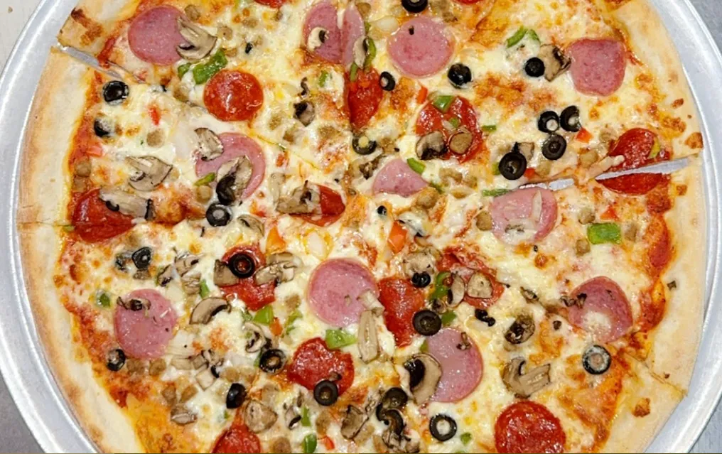 Pepperoni, Italian Sausage, Hamburger, Canadian Bacon, Mushrooms, Onions, Green Peppers, Green Olives, Black Olives.