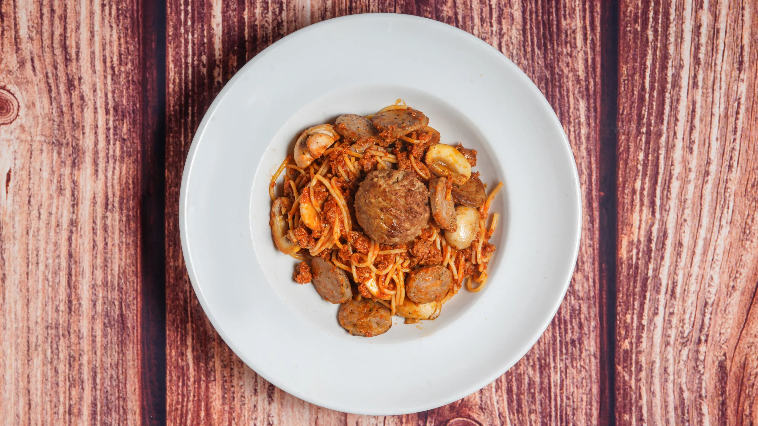 Italian Sausage, Mushrooms, Onions, Green Peppers, Marinara Sauce, Spaghetti Pasta.