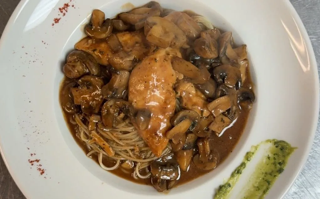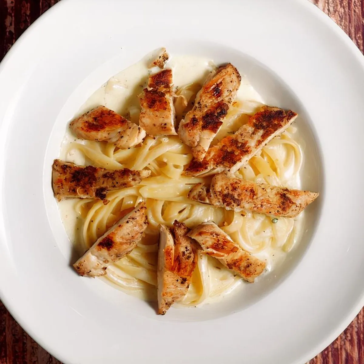 Grilled Chicken, Green Peppers, Onions, Jalapenos, Spinach, Tomatoes, Alfredo Sauce, Linguini Pasta.