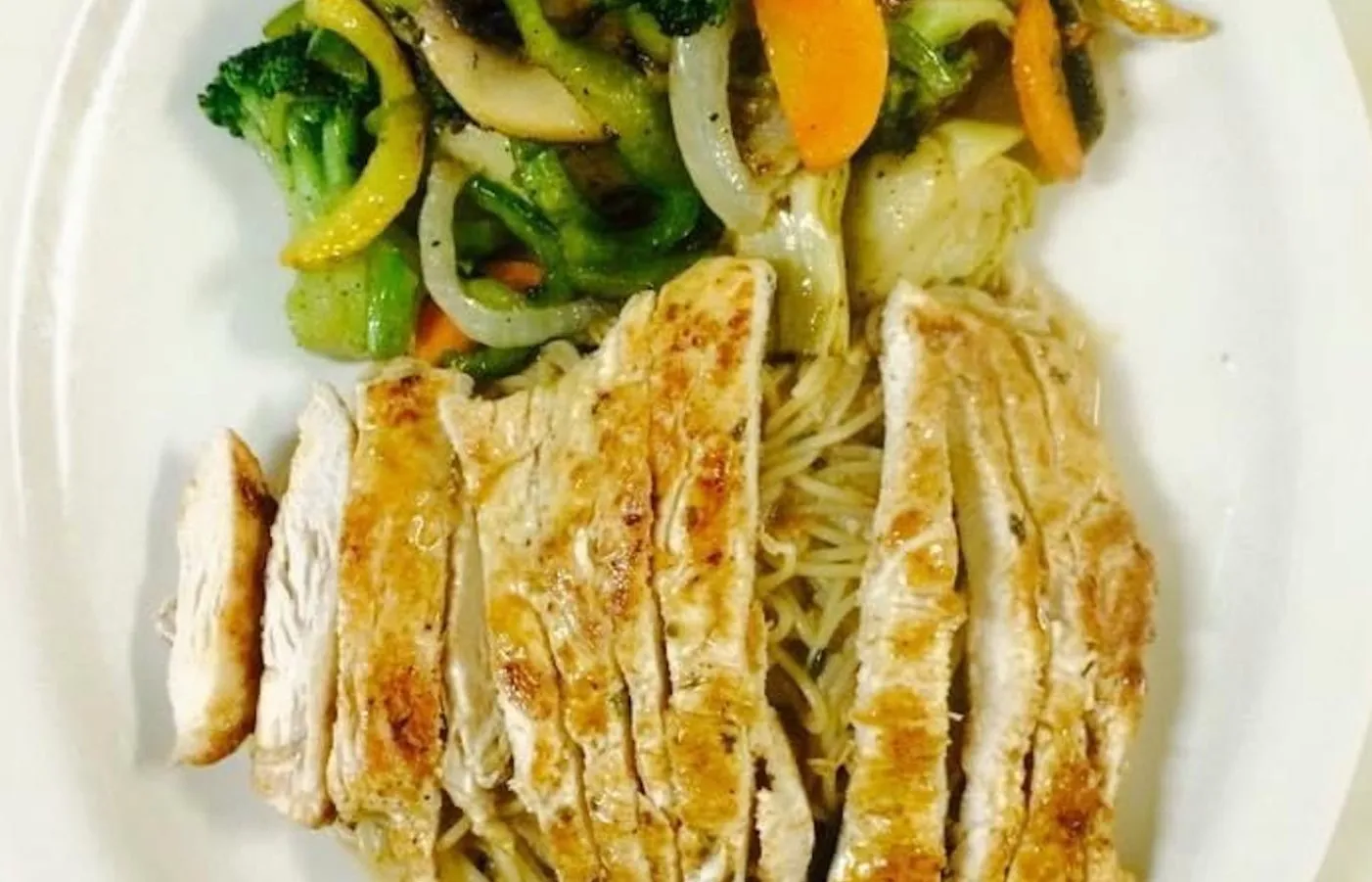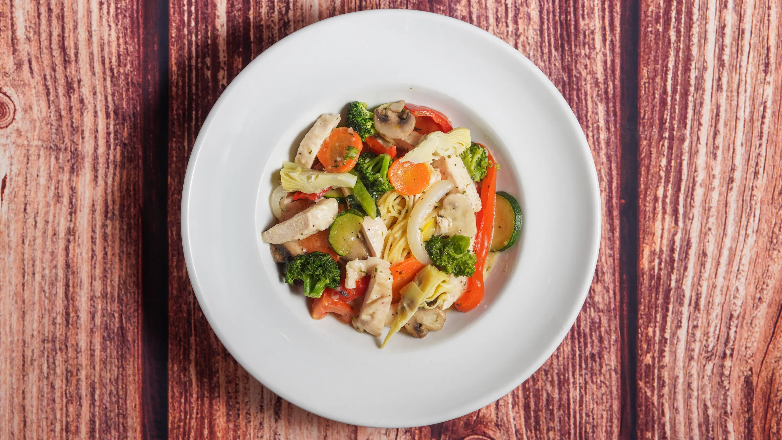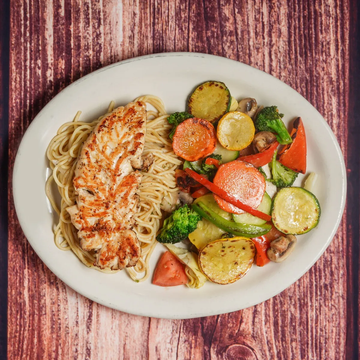 Grilled Chicken, Mixed Vegetables, Olive Oil, Basil, Garlic, Spaghetti Pasta.