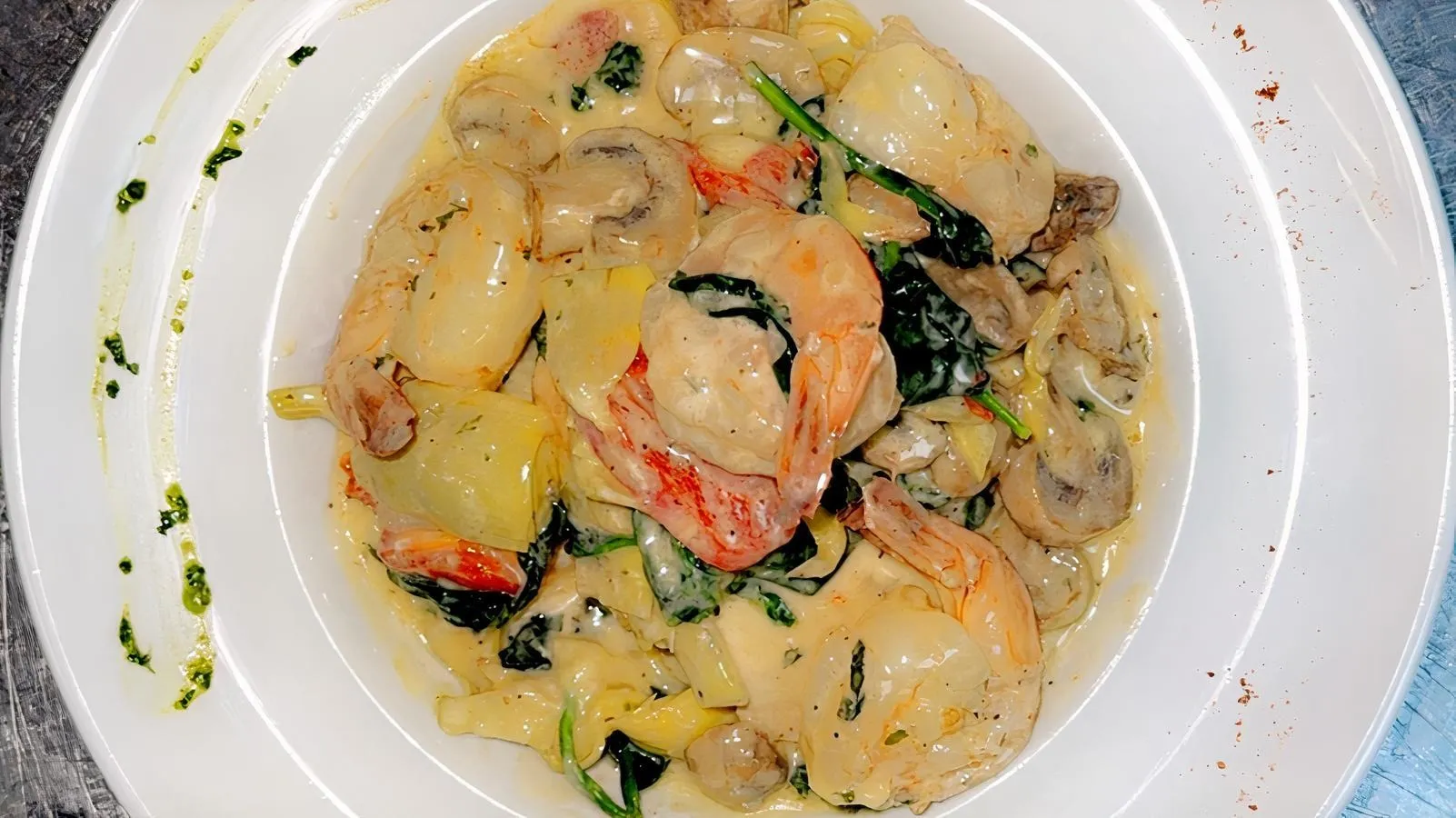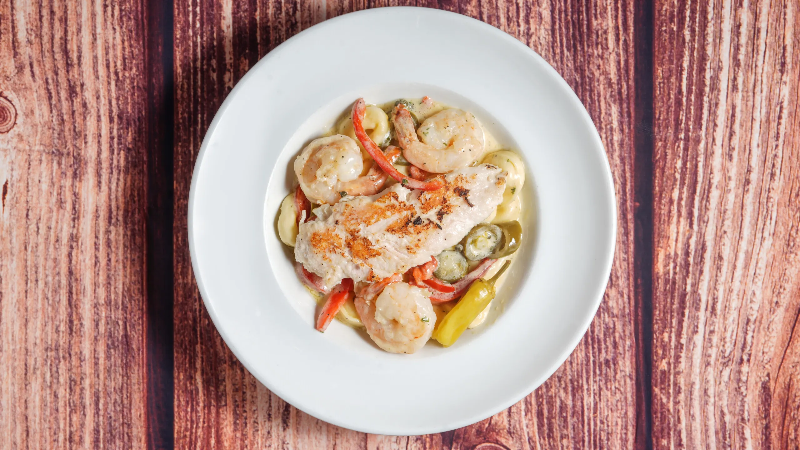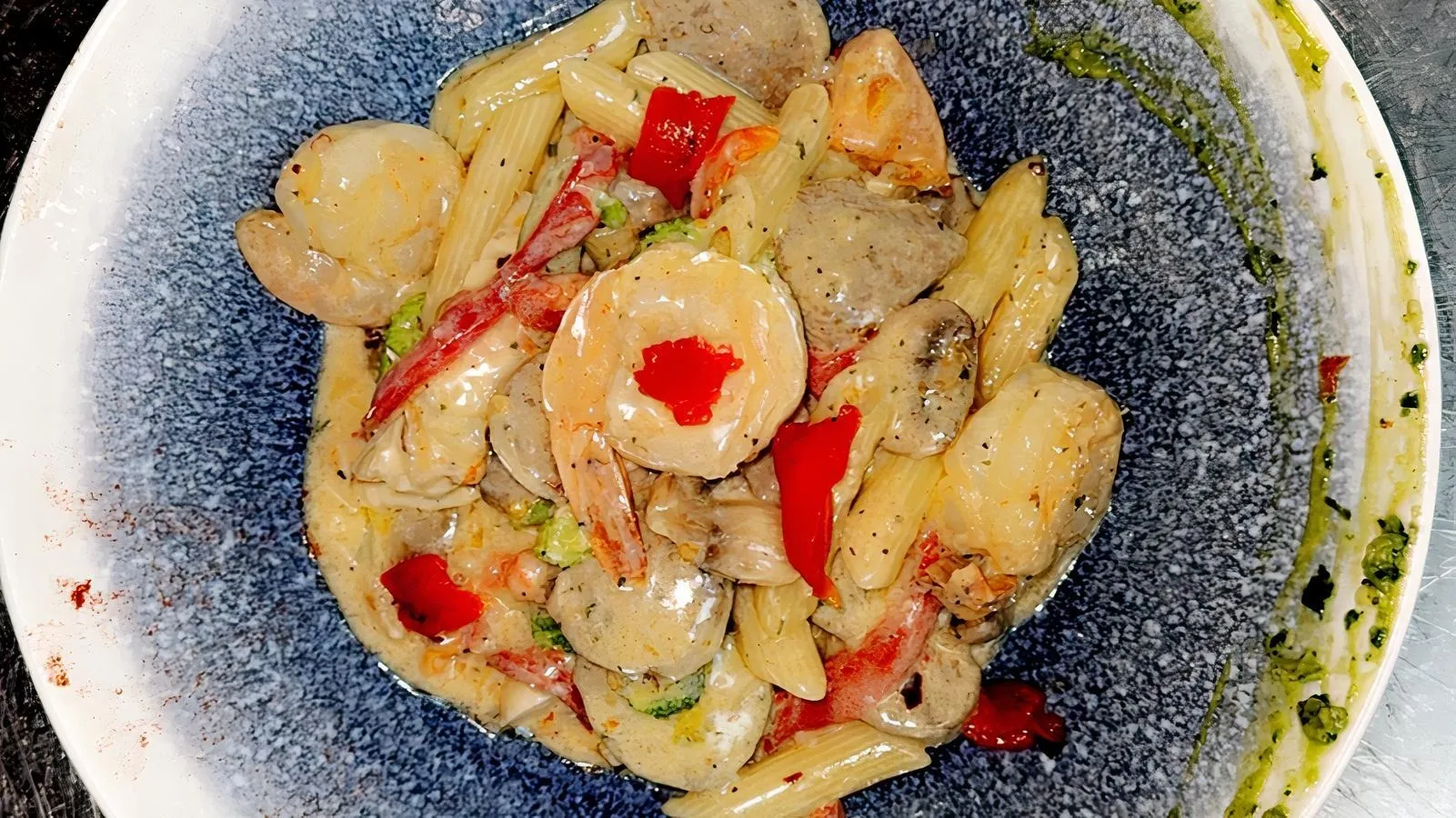 Chicken, Shrimp, Sausage, Tomatoes, Bell Peppers, Onions, Mushrooms, Broccoli, Cream Sauce, Penne Pasta.