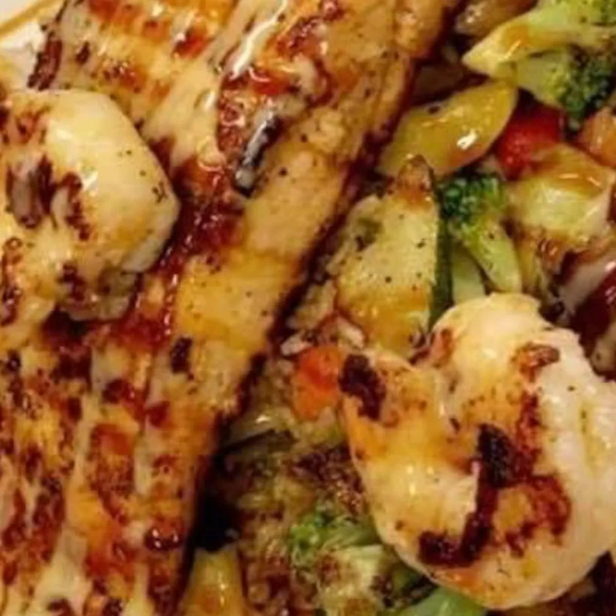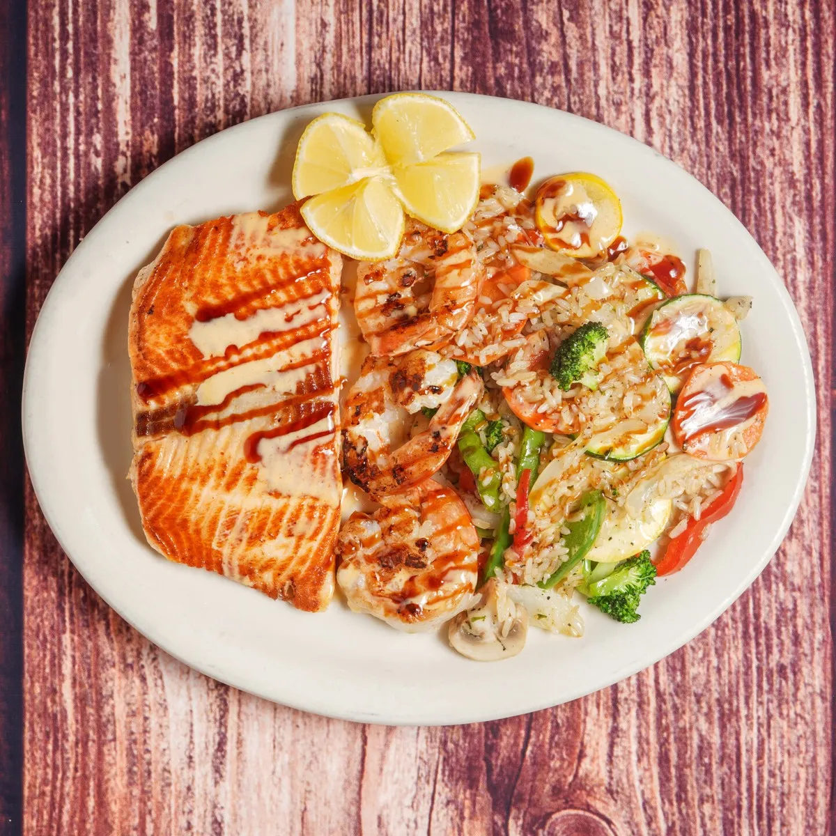 Fresh Atlantic Salmon & Shrimp, Sauteed Olive Oil, Garlic, Basil, Fresh Vegetables Over Rice.
