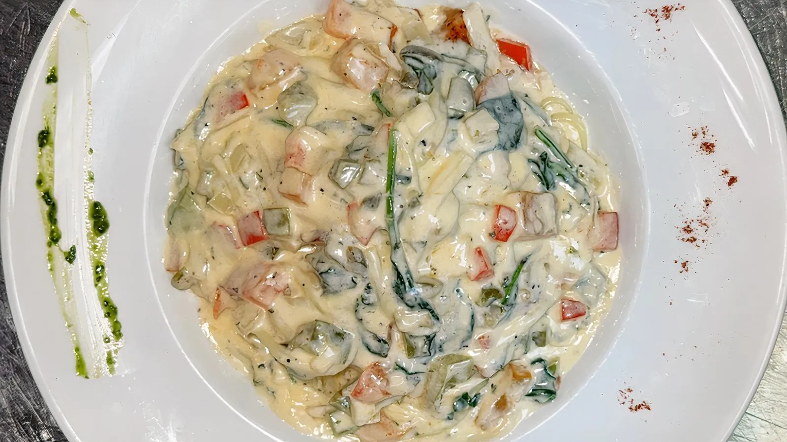 Grilled Chicken, Sauteed Green Peppers, Onions, Jalapenos, Spinach, Tomatoes, Alfredo Sauce Over Linguini Pasta.